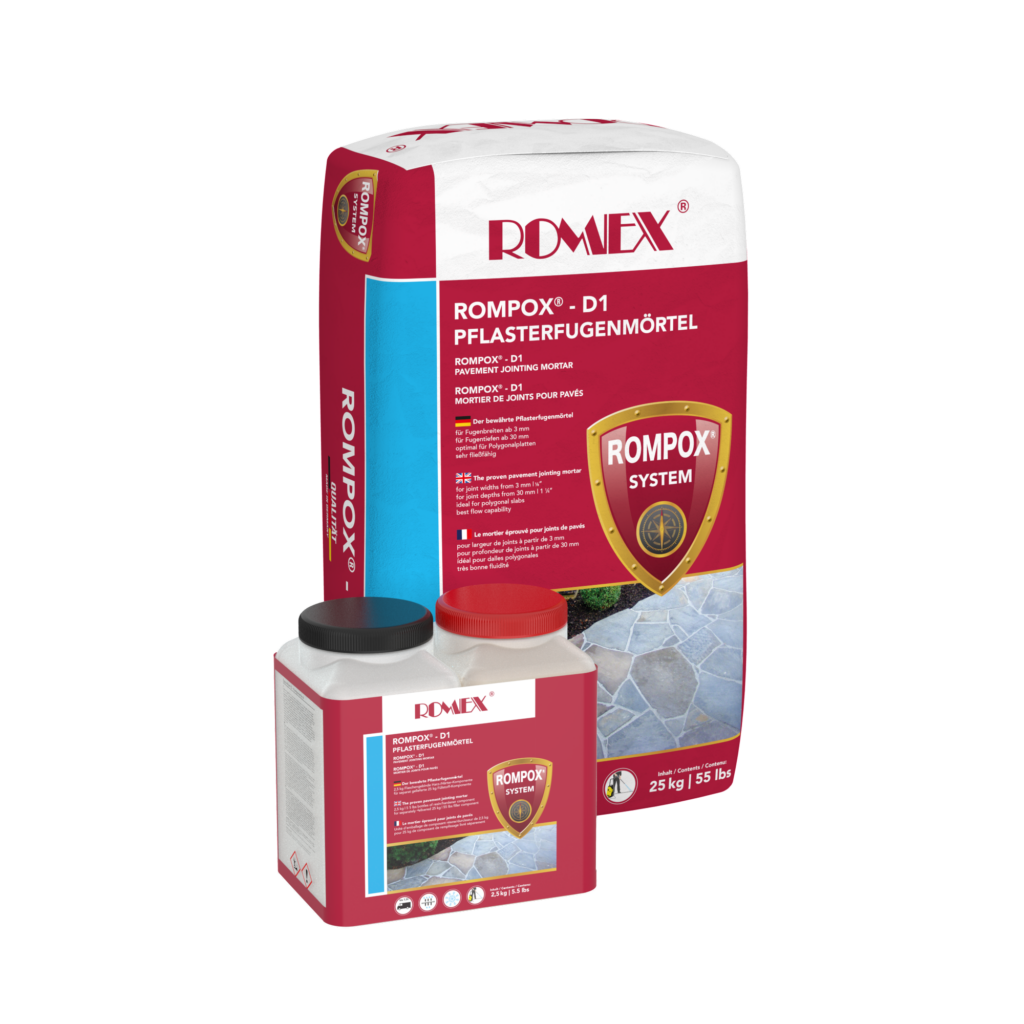Laiko patikrintas dvikomponentis grindinio užpildas ROMPOX® – D1 yra universalus produktas. Užpildas yra labai slankus ir takus, dėl šių savybių gali būti naudojamas siūlėms nuo 3 mm pločio. Taip pat tinka netolygių kraštų daugiakampių plokščių bei netaisyklingų formų gaminių grindinio siūlėms užpildyti. Šis užpildas puikiai tinkamas naudoti tiek nuolatinio transporto veikiamoje važiuojamoje zonoje tiek pėsčiųjų takuose esant apkrovoms iki 7,5 tonų. D1 taip pat labai veiksmingas natūralaus akmens grindinio remonto darbams.