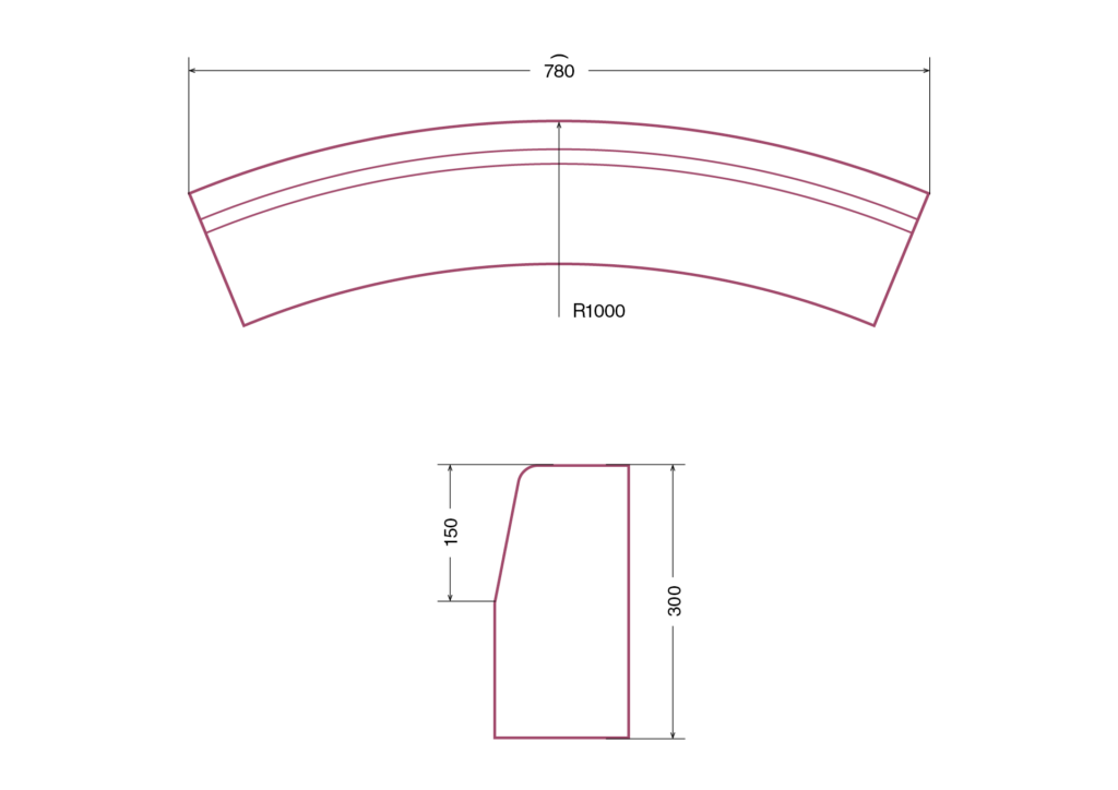 Lenktas bordiūras posūkiams formuoti. Lenkimo spindulys 1000 mm.