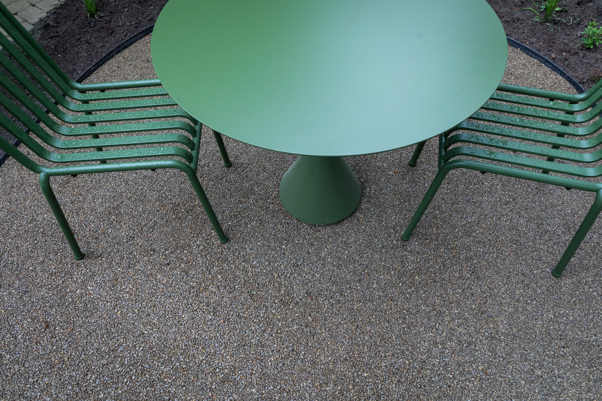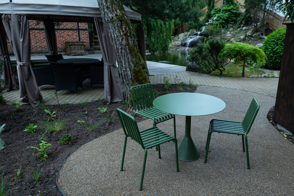 UAB Betono mozaika atstovaujamų produktų asortimente – siūlomas skaldos/ žvyro rišiklis Profi deko. Produktas, kuriuo padengiama švari ir sausa skalda tinka takams, takeliams, poilsio zonoms, zonoms aplink baseinus, gėlynus, o taip pat ir, kaip šiame projekte, lauko kavinės erdvėms.